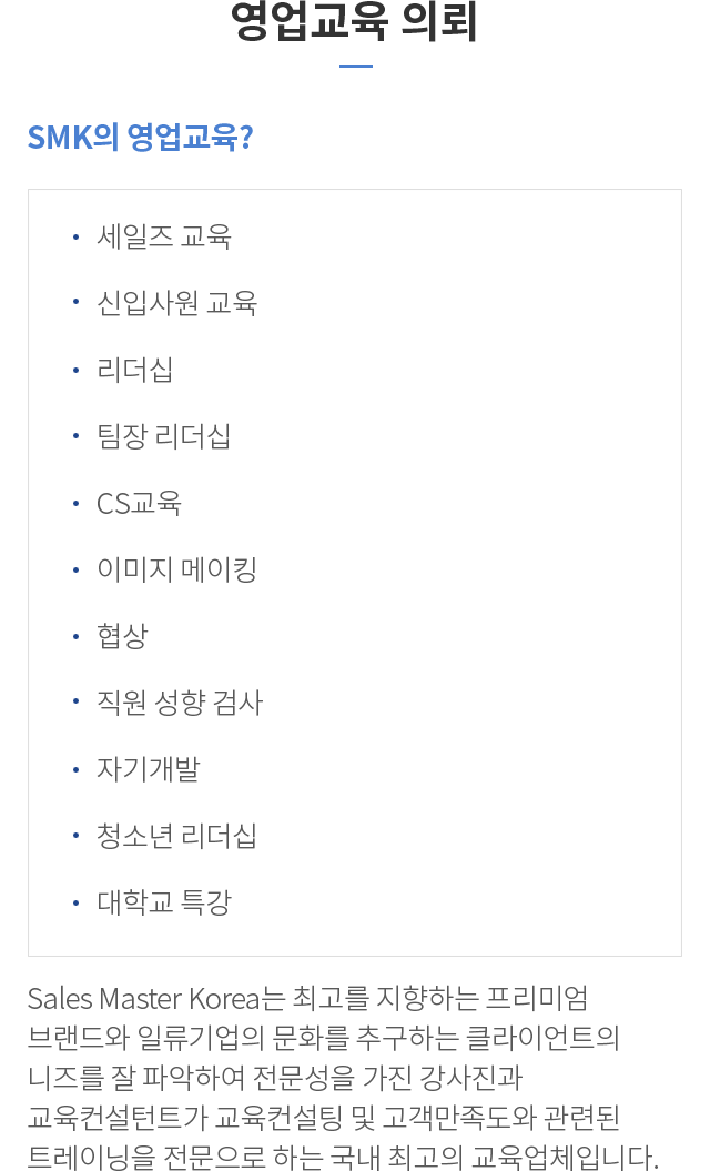 세일즈마스터코리아는 기업/단체 및 개인의 정보 수집 및 이용 등 처리에 있어 아래의 사항을 관계법령에 따라 고지하고 안내해 드립니다.